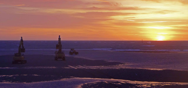 All the while( since before 7.00am ) the Digger, bulldozer and two trucks were building the road bridge (again) and making use of the short window of opportuniy to shift more shingle shorewards.